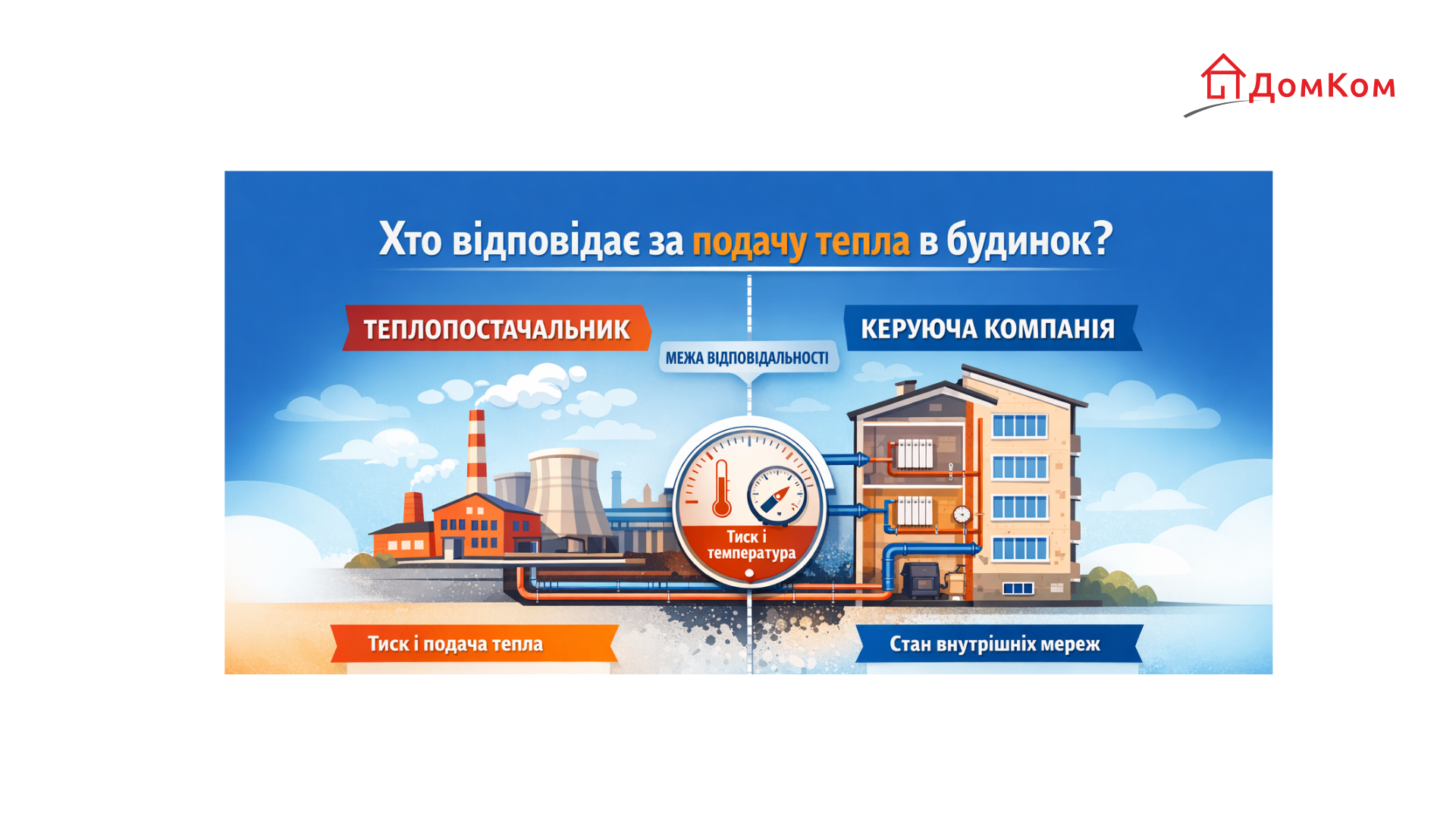 Керуюча компанія не є постачальником теплової енергії і не визначає параметри її подачі. Відповідальність управителя — це технічний стан будинку та його внутрішніх мереж. Розуміння цієї різниці дозволяє правильно адресувати звернення, уникати конфліктів і ефективніше вирішувати проблеми в опалювальний період.